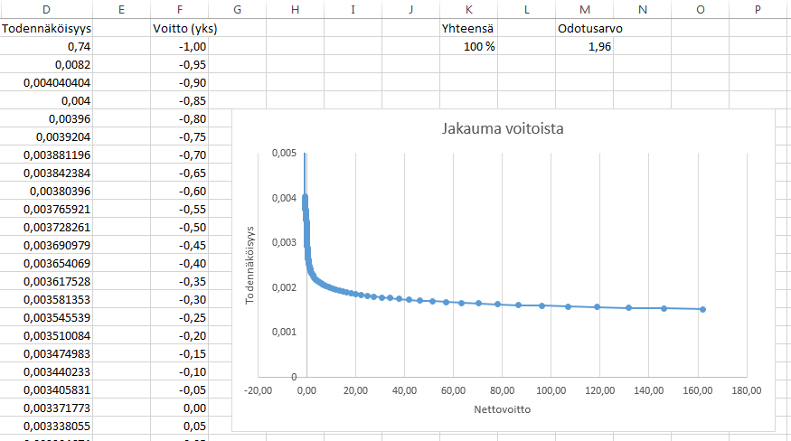 Panos on siis 1 yksikkö. Suurin mahdollinen voitto tässä vedossa on reilut 160 yksikköä ja sen todennäköisyys noin 2 promillea. Tässä esimerkissä lopun voitot on niin isoja että odotusarvo on plussalla. Tälle siis pitäisi löytää optimipanos suhteutettuna tietenkin omaan kassaan.