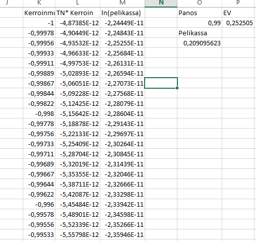 Saa nähdä ymmärsikö kukaan, mutta toivotaan apua pistetään kuvakin selventämään hieman. E:termi TN*kerroin ei ole mukana ln(pelikassa):n laskemisessa. Se nyt vaan on tuolla kohdalla.