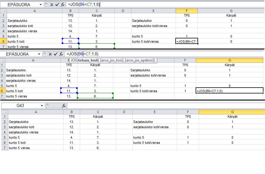 minulla on taulukossa vierekkäin vaikkapa kärppien sijoitus sarjataulukossa ja ilveksen sijoitus sarjataulukossa. Haluan excelin vertaavan onko esim kärppien sijoitus parempi kuin ilveksen, ja jos on niin excelin pitäisi palauttaa esim numero 1 ja jos ei ole niin numero 0. JOS funktio on tähän loistava, mutta se ei toimi kunnolla. Kuvasta jos katsoo niin B6 ja c7 sarakkeiden tiedot tulevat toisesta taulukosta ja toiseen taulukkoon taas netistä suoraan. ongelma on siis se että excel antaa tuloksen 0 vaikka oikeasti pitäisi antaa tulokseksi 1.