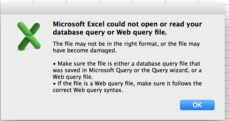 tälläistä erroria pukkaa, kun tein sen tiedoston tuonne query-kansioon, ja koitin saada exceliin: