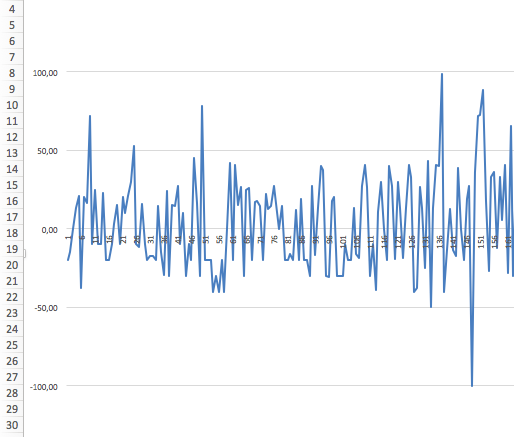 Pikku probleema! Aloitteleva Excel-käyttäjä ei saa janaa oikeanlaiseksi. Haluaisin liitetyn kuvan kaavion sellaiseksi, että se kuvaisi kokonaisvoittoja eikä yksittäisten vetojen tulosta. Miten onnistun?