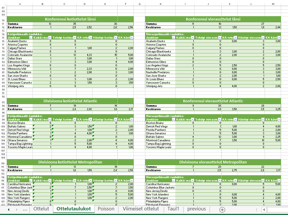 Nyt on ihan pakko kysyä, koska oma ymmärrys ei enää riitä ja saman ongelman kanssa on nyt painittu pari viikkoa. Nappasin netistä melko näppärän oloisen poisson-laskurin, jota lähdin parantelemaan omia tarpeita vastaavaksi. Ensimmäisellä välilehdellä on Query-kysely Liigan otteluohjelmasta. Koti- ja vierasjoukkue on jaettu omiin sarakkeisiinsa, samoin kuin kyseisten joukkueiden tekemät maalit. Seuraavalla lehdellä on taulukot, koti- ja vierastilastoille omansa. Kyseiset taulukot hakevat otteluita ja maalimääriä ensimmäiseltä lehdeltä. Niiden ensimmäisissä sarakkeissa sijaitsevat joukkueiden nimet, seuraavassa ottelumäärät, tehtyjen ja päästettyjen keskiarvot jne. Ja tästä alkavat ongelmat: