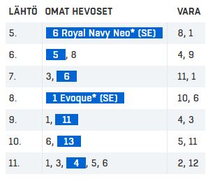 TOTO64-5 : #8 Varsova on jätetty pelaajien toimesta nelossuosikiksi, vaikka se on varmasti potentiaalisin haastaja suosikille. Laukat ovat sotkeneet viime kilpailuja ja toki riskinä on nytkin laukkaan kilpailun pilaaminen. 8% kannatus on kuitenkin yhtä pahasti alakantissa kuin Sanni Skylla joten kyllä maistuva ideavarma saadaan tästäkin