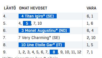 Magic monday ja T6 ja 1/10 osa ja 9.60. Haetaan isompaa pottia vain yhdellä suosikki varmalla eli ekan lähdön voittaa ilman kompastumista mt master don, sitten merkkejä huolella parissa kylmäverisessä ja sitten yksi suosikki 5radalta todella ylipelattuna pois kokonaan ja sitten jätti suosikki joka ei saa keuloja mitenkään niin sekin varmistellaan ja lopuksi käsittämättömän vähän pelattu varma joka 8radalta Nurmosen suoraviivaisella ja mailille erinomaisesti sopivalla ajo tyylillä kyllä kiertää nämä yli kerran kolmesta....
