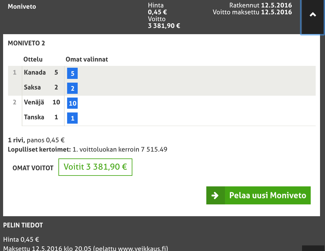 Ranska vs Venäjä samoiset 10/10 jäi kokonaan laittamatta. Mukavasti lähti kun ainoa veto osui, mutta on tämä vedonlyönti ihmeellistä, kun osunut veto jää harmittamaan.