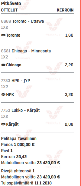 01.01.2018 18:50 <Gini> Kova tulos!YK peesit 1500 vetoo 99%.Ilman Valiovihjettä 102%
