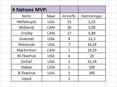 Arvioni 4 Nations Face-Off-turnauksen MVP-pelaajasta: