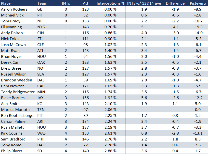 Kuvasta näkyy tähän asti kauden interception raten parhaat (toisessa päässä muuten Andrew Luck, jolla interception rate 6% vs. kahden edelliskauden keskiarvo 2%). Lisäsin tuohon myös vertailun vuoksi "oletetut" interi-määrät, mikäli rate olisi ollutkin kahden edelliskauden keskiarvojen tasolla. Piste-ero on laskettu käyttämällä karkeaa arviota pallonmenetyksen keskimääräisestä pistearvosta. Jossain tutkimuksessa myös oli mainittu, että yhden turnoverin arvo on noin 0.2 voittoa, mikä on aika paljon.