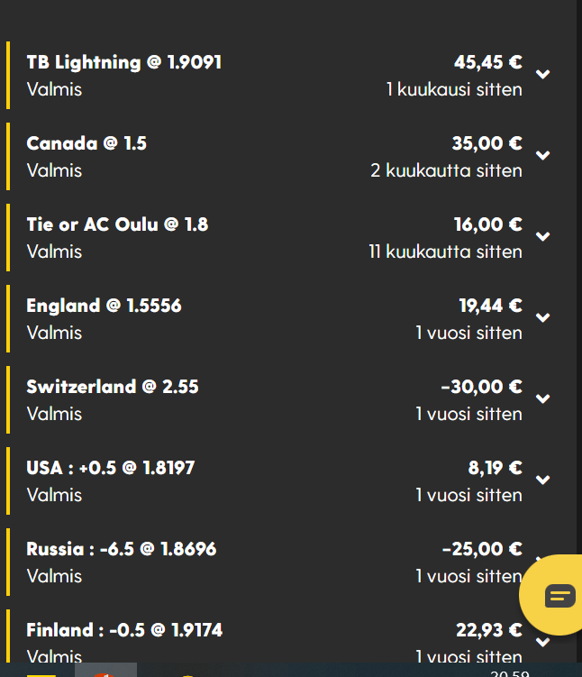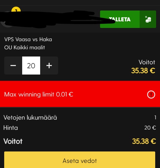 Koitin heinäkuun lopussa pelata Bethardille, max voitto oli 0,01 € (liite), vaikka ko firmaan ei ole montaa vetoa(liite) edes ollut viim vuoden aikana, panoksetkin olleet joitakin kymppejä...johnny_sins kirjoitti: ↑23.07.2022, 11:12itse pääsin betsafen vip klubiin muutama viikko sitten ja joka sunnuntai tuli 100€ talletusbonus, sitä kestikin muutaman viikon ja sitten napsahti bonusbännit kaikille betssonneille : D
