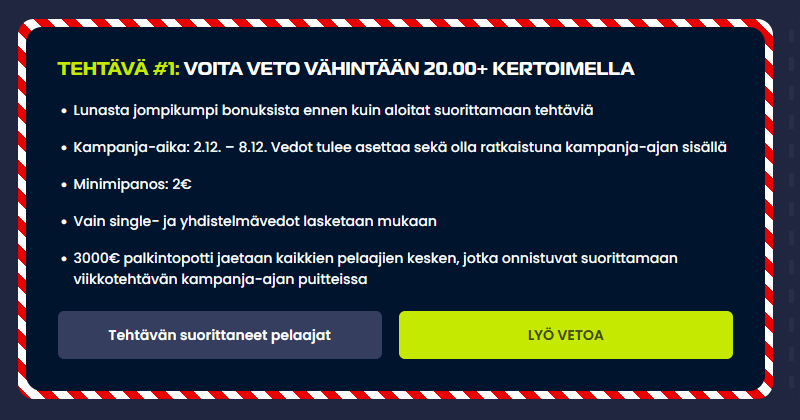Joka joulukuun viikko aukeaa uusi tehtävä suoritettavaksi. Ensimmäiseksi pääset lunastamaan bonuksen joko Vedonlyöntiin tai Kasinolle – voit lunastaa halutessasi myös molempiin. Tämän jälkeen pääset itse tehtävien kimppuun. Tutustu tämän viikon tehtävään ja nappaa osuutesi palkintopotista!