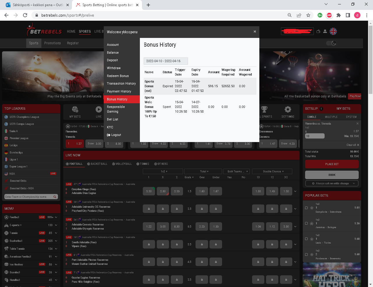 Täällä ainakin homma pelannut ihan hyvin. Toi 150+150 urheiluvedonlyönnin bonus piti kysellä s-postin kautta, jotain koodia hyödyntäen. Kierrätys meni suht helposti vedellen NBA ja futiksen player propseja, niissä tuolla helppoa valueta saatavilla jos vähän jaksaa penkoa. Joku sivuston päivitys tuli kesken kierrätyksen (n. 10pvä sitten) ja bonus hävisi hetkellisesti mutta chatin kautta kyselemällä palautui takaisin. Rahatkin sai nosteltua ongelmitta, ja olen vielä tuon bonuksen jälkeenkin pelaillut tuolla jonkun verran kun limittejä ei vieläkään ole näkynyt.
