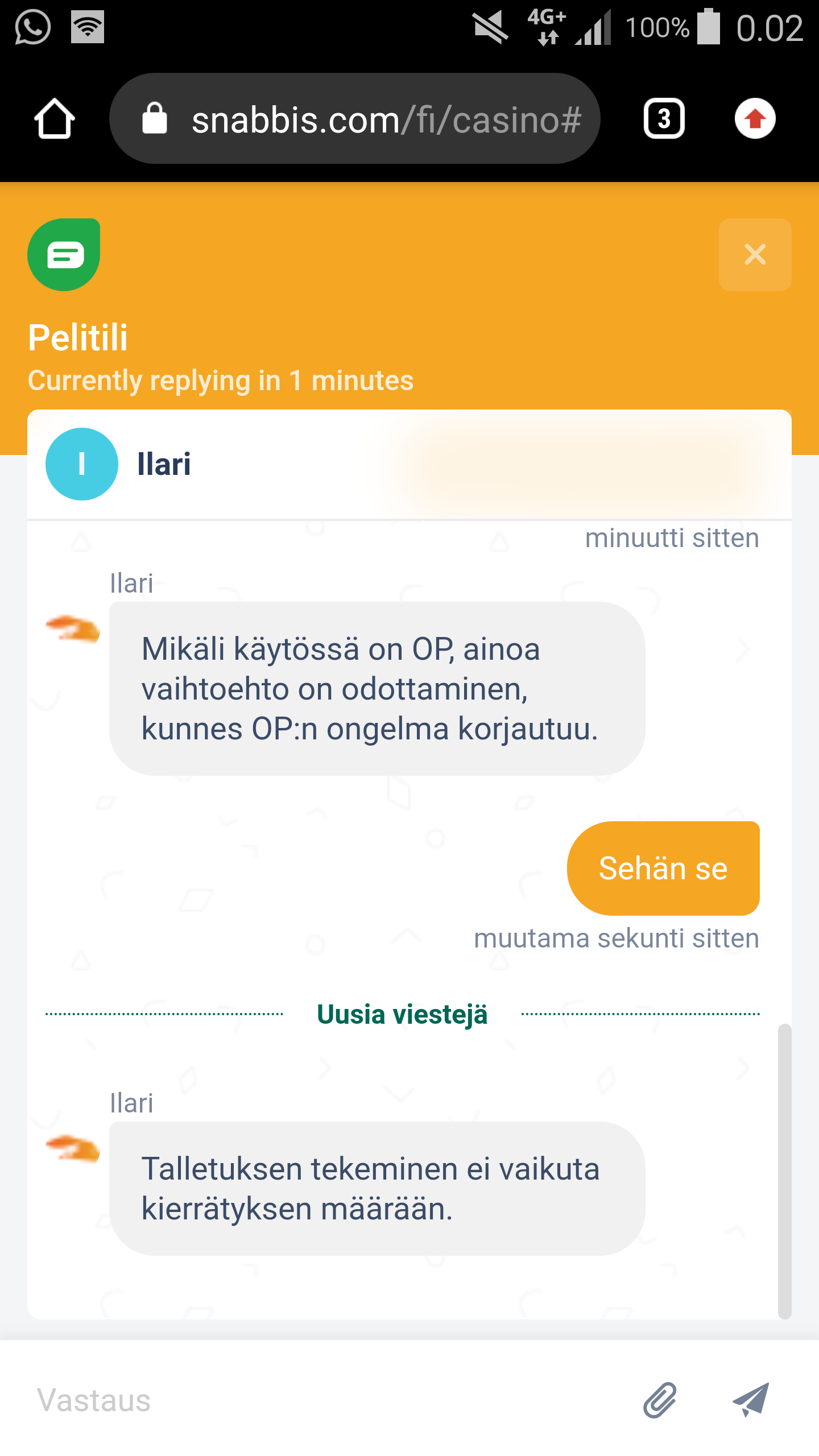 27.10.2021 00:42 <jousou> Juurikin samaa. Op chätissä sanoi että ei yleistä ongelmaa. Snabbiksen chätti