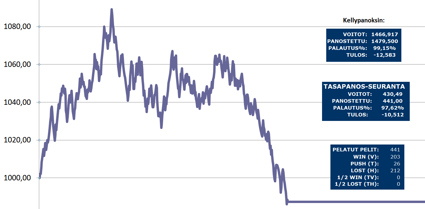 - Viime vuoden maksullisten Playoffien palautus kellypanoksilla tuotti lukemat 105,08% (+17,21 yksikköä) ja tasapanoksin 103,38% (+2,91 yksikköä).