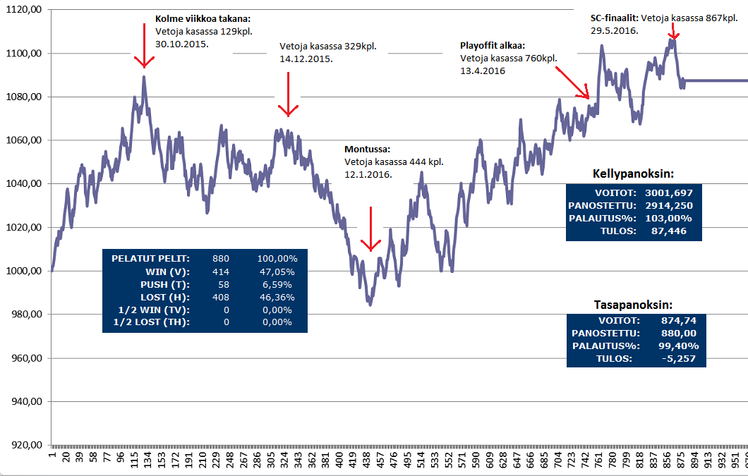 Montun pohja saavutettiin 12.1.2016, jolloin kuvainnollisessa 1000 yksikön kassassa oli kasassa vain 984 yksikköä. Vihjeiden tuloksellinen huippu saavutettiin hieman ennen Stanley Cup-finaalien alkua, jolloin kasassa oli 1106,13 yksikköä.