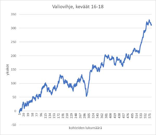 Kuten ketjun hiljaisuudesta voi päätellä, syyskausi on sujunut vedonlyöntirintamalla aurinkoisen taivaan alla. 141 kohteeseen on panostettu 736 yksikköä ja kohteet ovat palauttaneet runsaat 847 yksikköä, muodostaen palautusprosentiksi reippaat 115. Viime vuosina juuri kevät on kuitenkin ollut Valiovihjeen kulta-aikaa ja toivotaan trendille jatkoa myös alkavana keväänä.