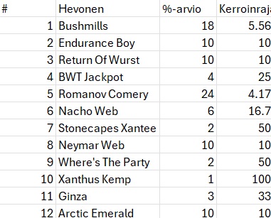 Vihjeet yhteensä: panokset 3.00, palautukset 0.00, tulos -3.00 yksikköä.