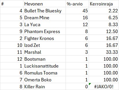 Vihjeet yhteensä: panokset 8.00, palautukset 5.75, tulos -2.25 yksikköä.