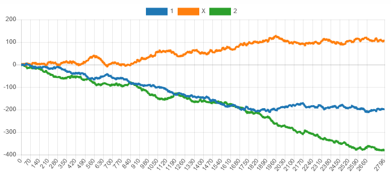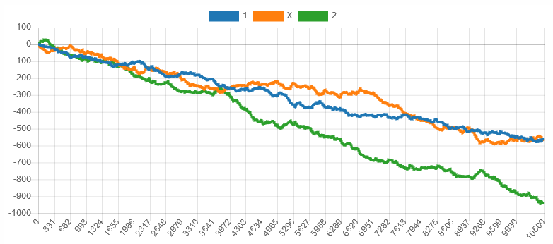 Mukaan valikoituu näin ollen 2796 peliä, tasapelejä on 915kpl (32,73%) ja palautusprosentti 103,9%.