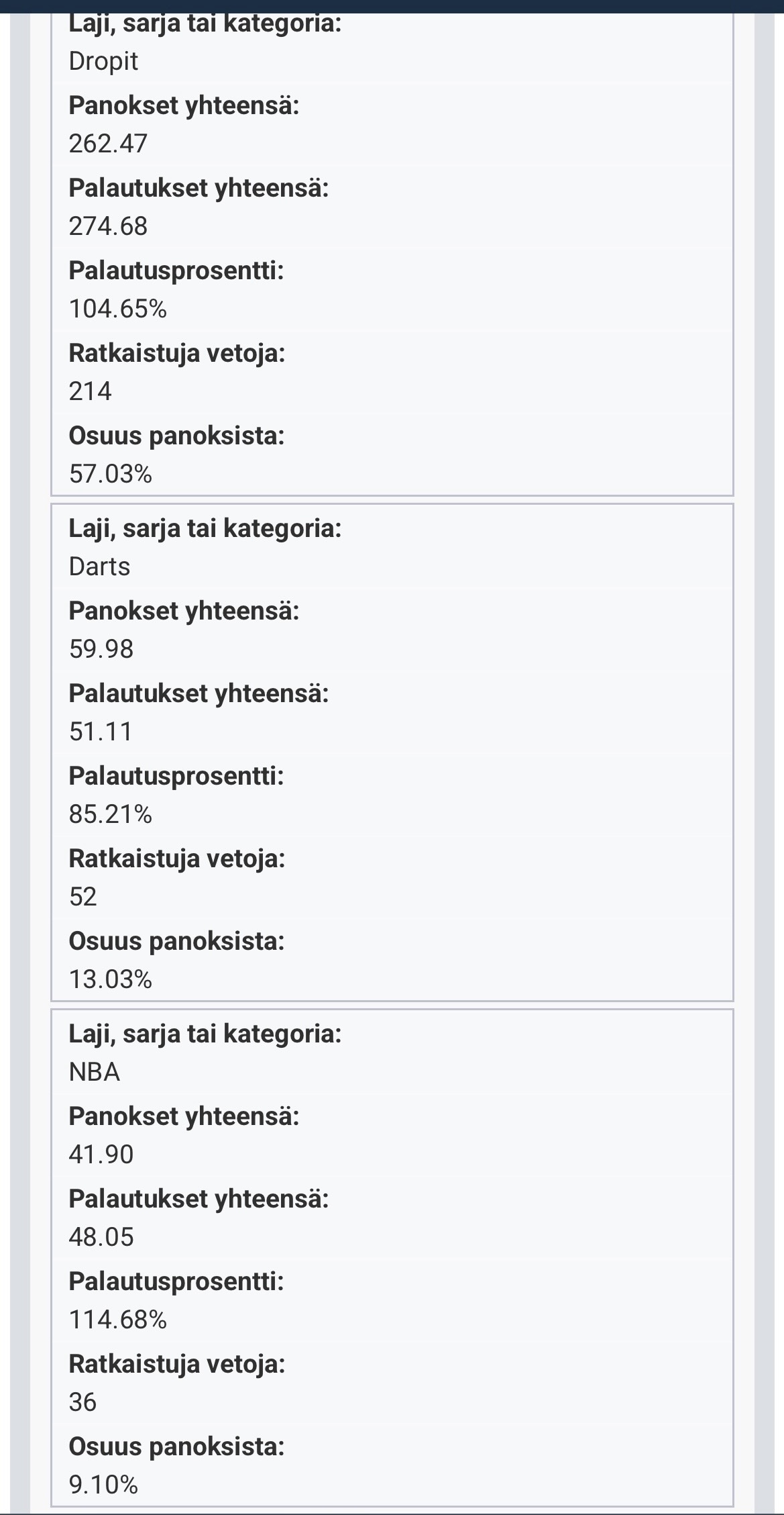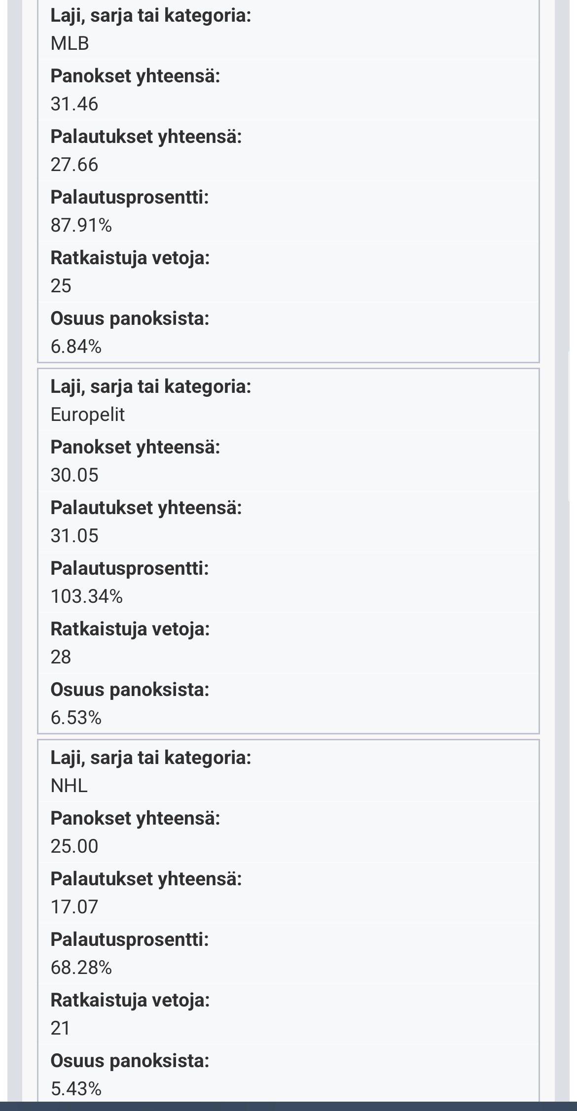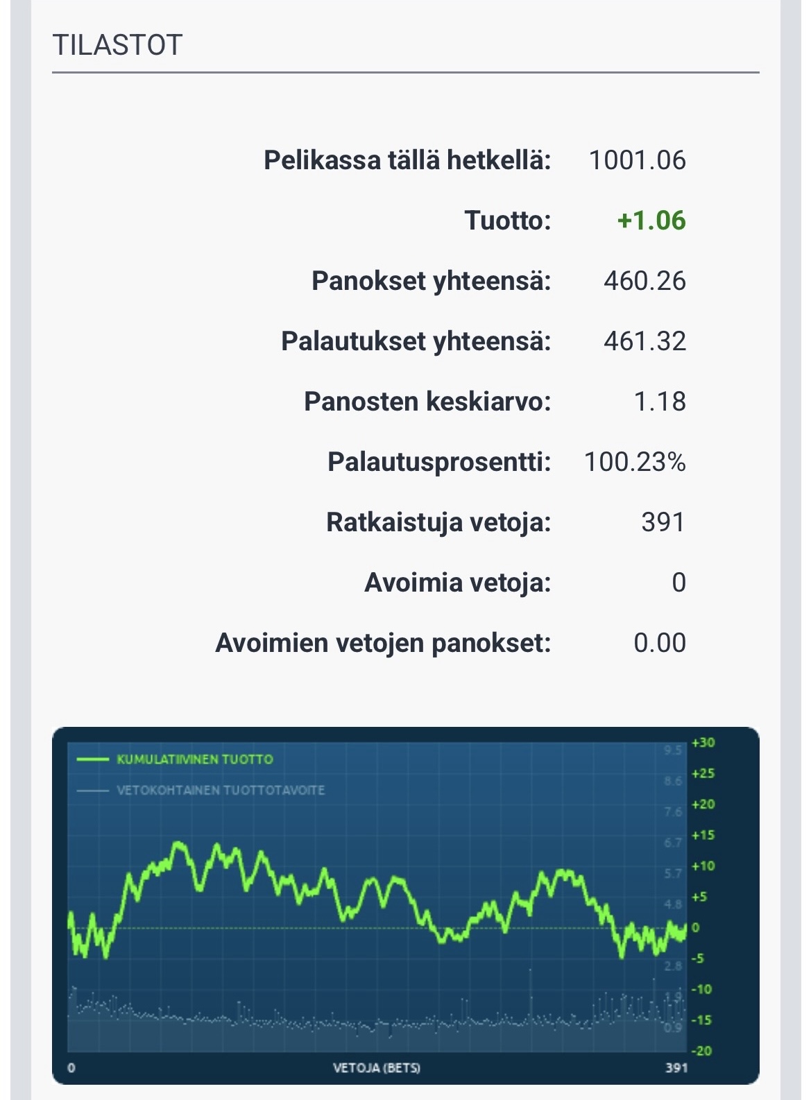 Vihjeet yhteensä: panokset 4.00, palautukset 3.50, tulos -0.50 yksikköä.