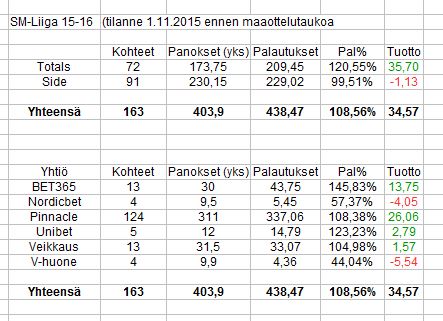 Vihjeet yhteensä: panokset 39.25, palautukset 35.79, tulos -3.46 yksikköä.