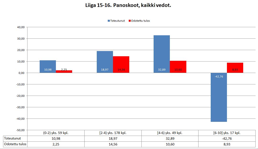 Katsaus kuluneen liigakauden vetoihin. Ylikertoimen seurannan vedot jäivät pakkaselle muutaman yksikön. Tägätyt sidevedot tuottivat noin +17 yks. ja totalit -15 yks. Mestaruus- ja kausivedot veivät kokonaistuloksen 7 yks. pakkaselle.