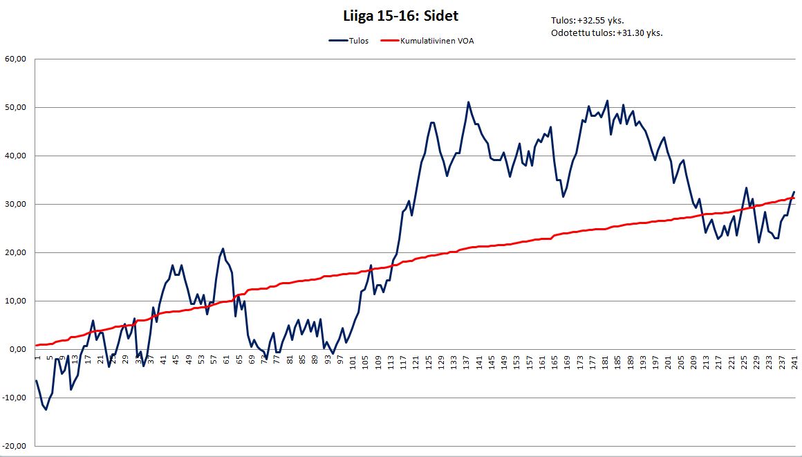 Omassa seurannassa tulos on hieman parempi. Muutama yksittäinen veto jäi syyskauden kiireessä tägäilemättä. Joissain tapauksissa pelasin eri pelimuotoa tai otin vedon Matchbookin kautta, jossa vaihdot jäi melko pieneksi. Omassa seurannassa sidet +38.8 ja totalit, kausivedot yms. -18.