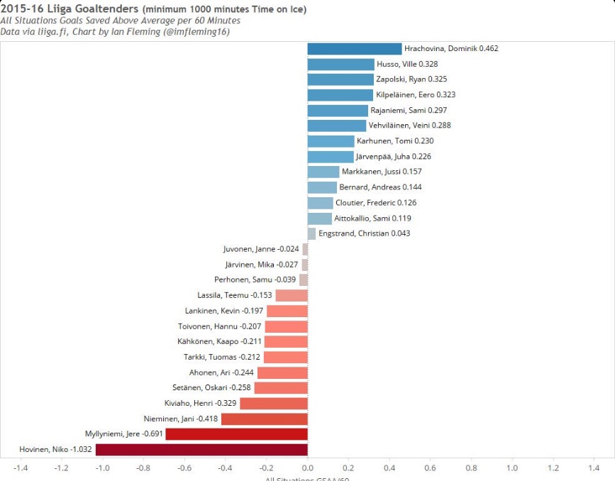 Kuvassa liigan maalivahtien viime kauden GSAA/60 -lukemia. (Goals saved above average / 60). Intuitiivisesti lukema tarkoittaa sitä, kuinka paljon enemmän maalivahti torjuu laukauksia (per peli) verrattuna sarjan "keskitasomaalivahtiin". Eli muistaakseni: kohdatut laukaukset * (oma t% - sarjan ka. t%) / pelatut kyyskymppiset. Ei ole oma graafi. Krediitit https://twitter.com/imfleming16