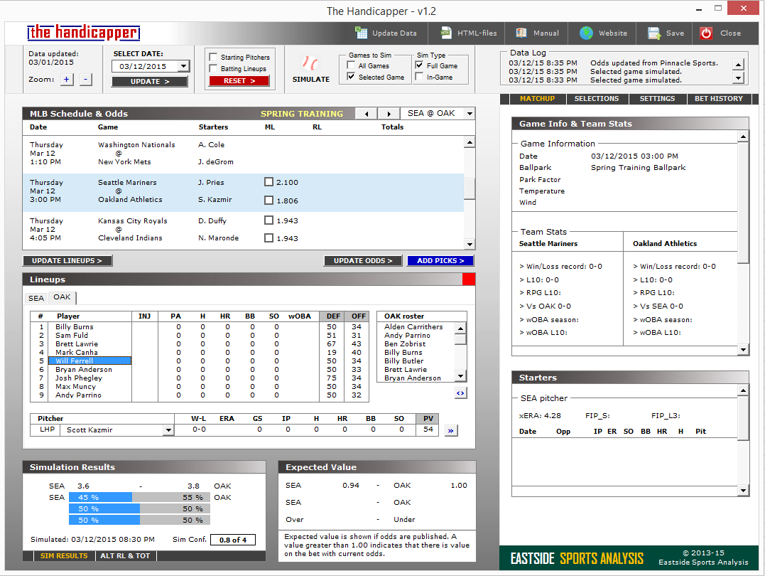 Myös Spring Training otteluita voi nyt simuloida The Handicapper v1.1:llä, joka löytyy kotisivuiltani. Uutena ominaisuutena mahdollisuus hakea julkistetut kokoonpanot netistä.