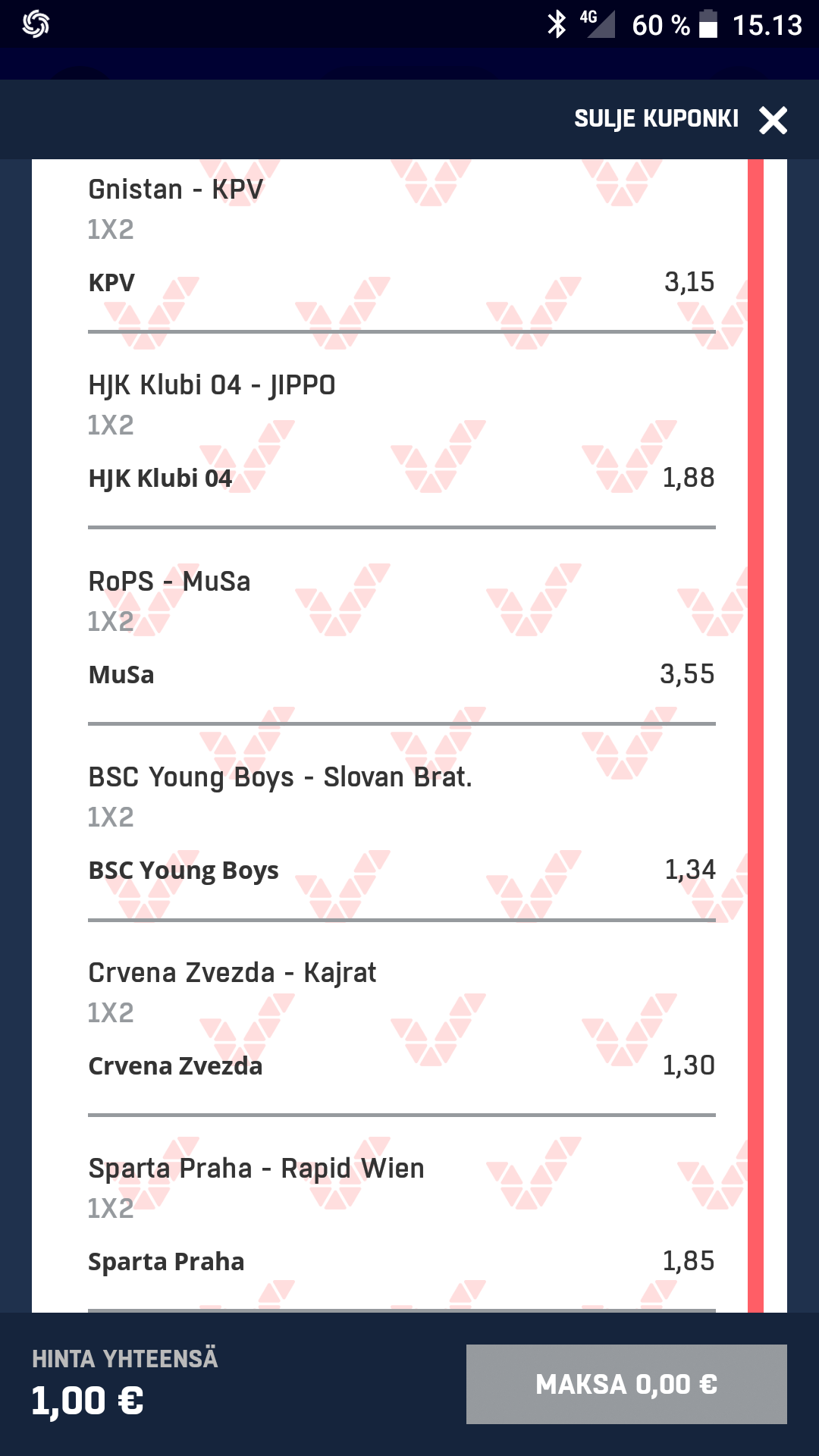 Vedonlyöntivihje: 3.6.2021 16:15 - Jääkiekon MM2021 - USA - Slovakia - peliaika päättynytkohde USA - Slovakia veto Alle 5,5 maalia kerroin 1.580 (Unibet) panos 1.32 yks.