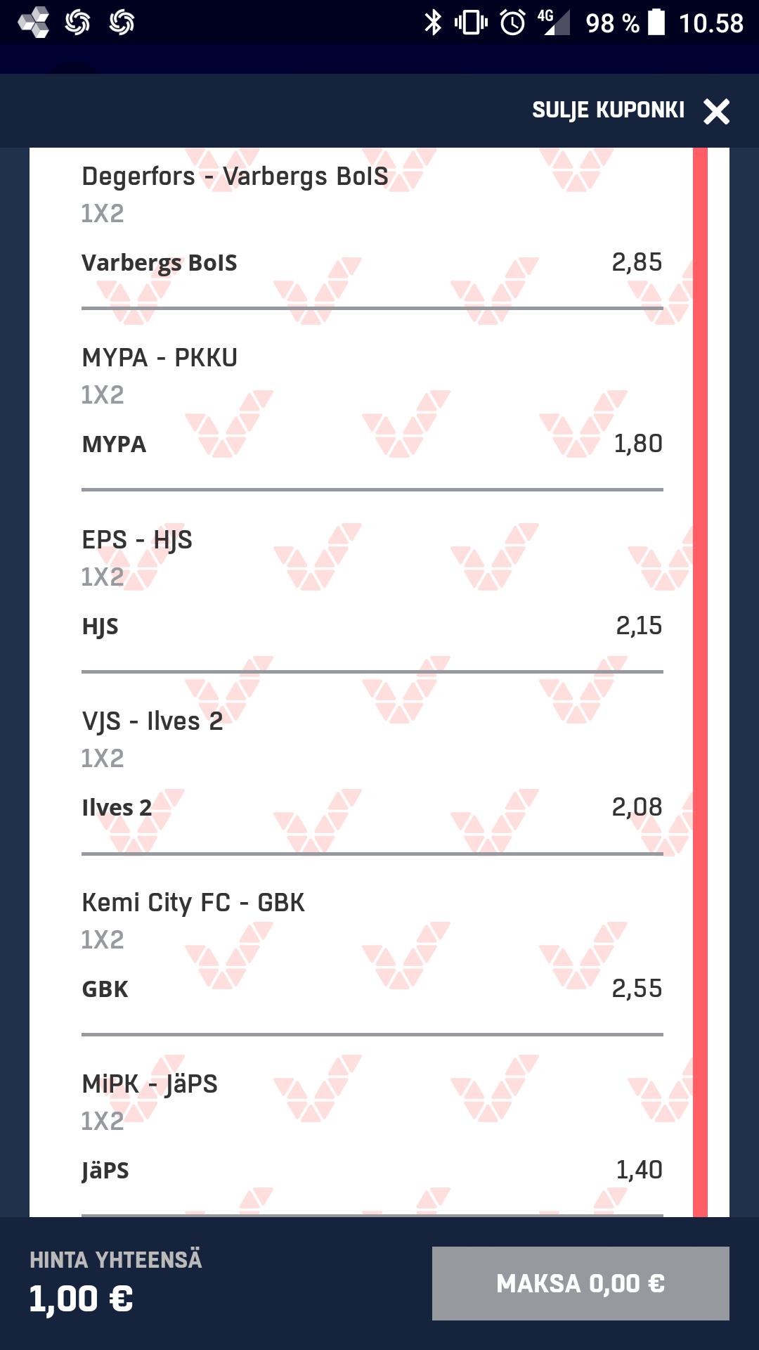 Vedonlyöntivihje: 1.6.2021 19:00 - Kakkonen Lohko A - JäPS - Kiffen - peliaika päättynytkohde JäPS - Kiffen veto JäPS kerroin 1.450 (Unibet) panos 1.64 yks.