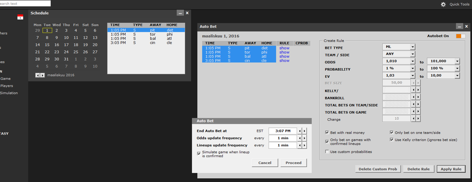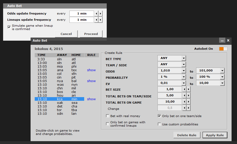 1) käyttäjä voi luoda sääntöjä automaattista vedonlyöntiä varten