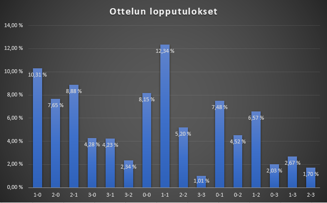 Heitetäänpä tähän alle prosentteja jalkapallo-otteluiden lopputuloksista. Nämä perustuvat yli 22000 lopputulokseen Eurooppalaisista jalkapallosarjoista.