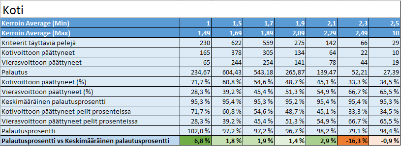 Alla vielä taulukko, jossa näkyy eriteltynä miten olisi käynyt eri kertoimilla pelattaessa. Eli jos olisi pelannut kotijoukueelle kaikki pelit, joissa keskimääräinen kerroin oli 1,49 tai alle, niin olisivat pelit olleet voitollisia.