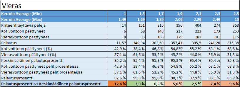 Ja alla sama taulukko, jos olisi pelannut aina vierasjoukkueita keskiarvo kertoimella. Palautusprosentti olisi ollut kaikista näistä peleistä 92,2.