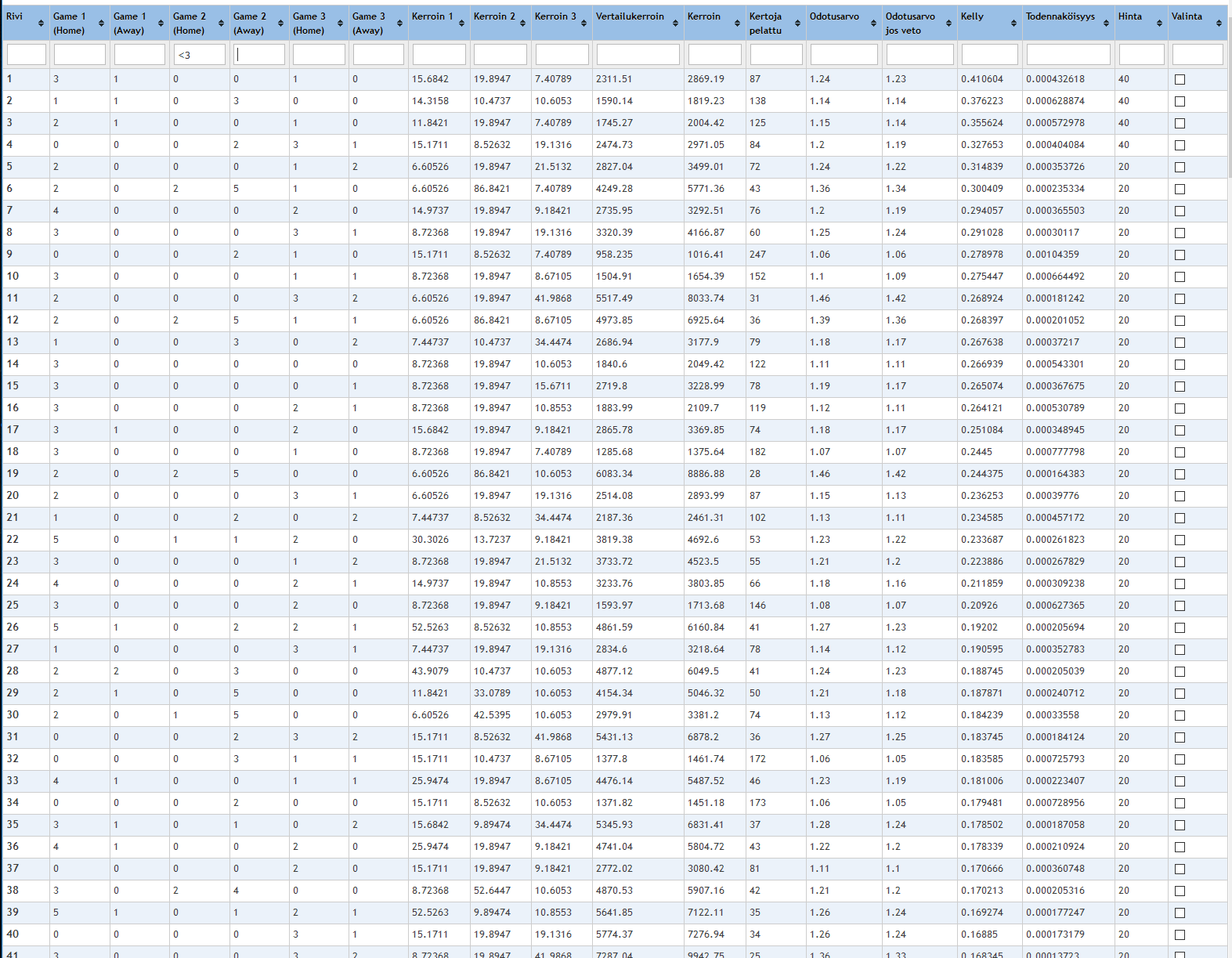 Monivedon pelaaminen on ollut minulla tässä jonkin aikaa jäissä, mutta otetaanpa se nyt taas uudelleen käsittelyyn. Eli aikoinaan tein tuollaisen nettisivun (alla kuva tuosta sivusta), jonka kautta pystyn poimimaan mielestäni hyvät yhdistelmät ja pelaamaan nämä automaattisesti. Ongelmahan tässä on se, että kun veikkaus julkaisee viimeiset kertoimet ennen pelin sulkeutumista, niin tämän jälkeen tulee vielä niin paljon pelejä näille yhdistelmille ja monen odotusarvo näistä painuu negatiiviseksi. Otetaanpa tämä nyt tarkastelun alle ja katsotaan olisiko tuossa monivedossa vielä jotain valueta jäljellä.