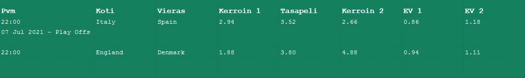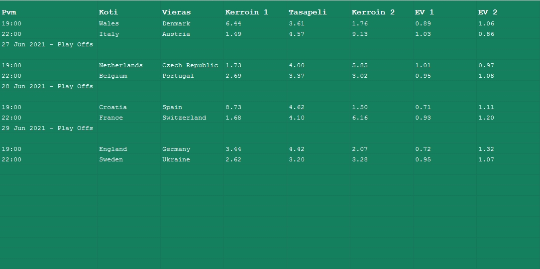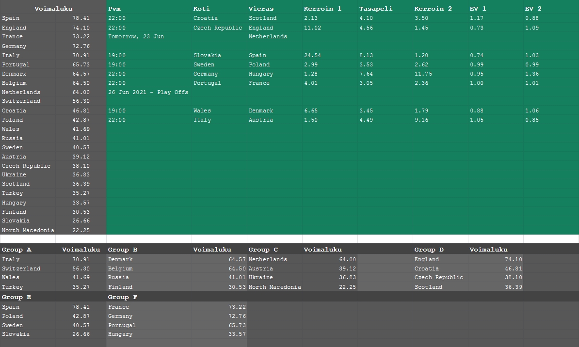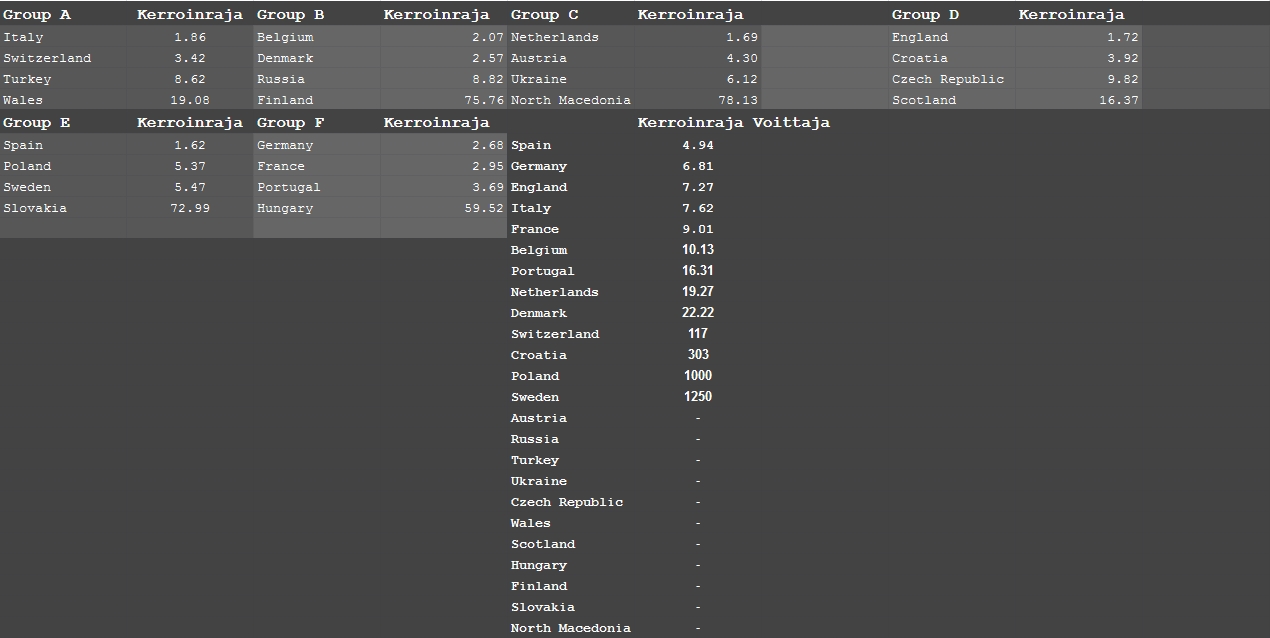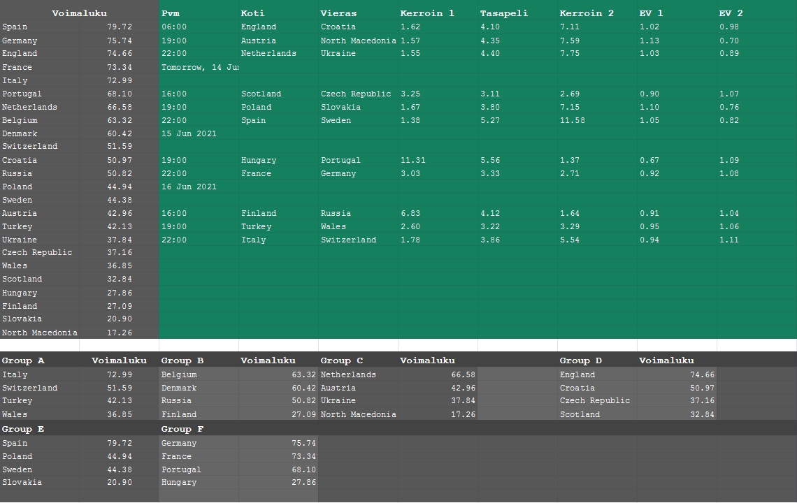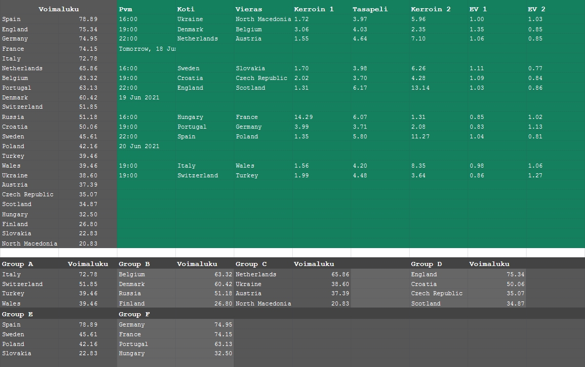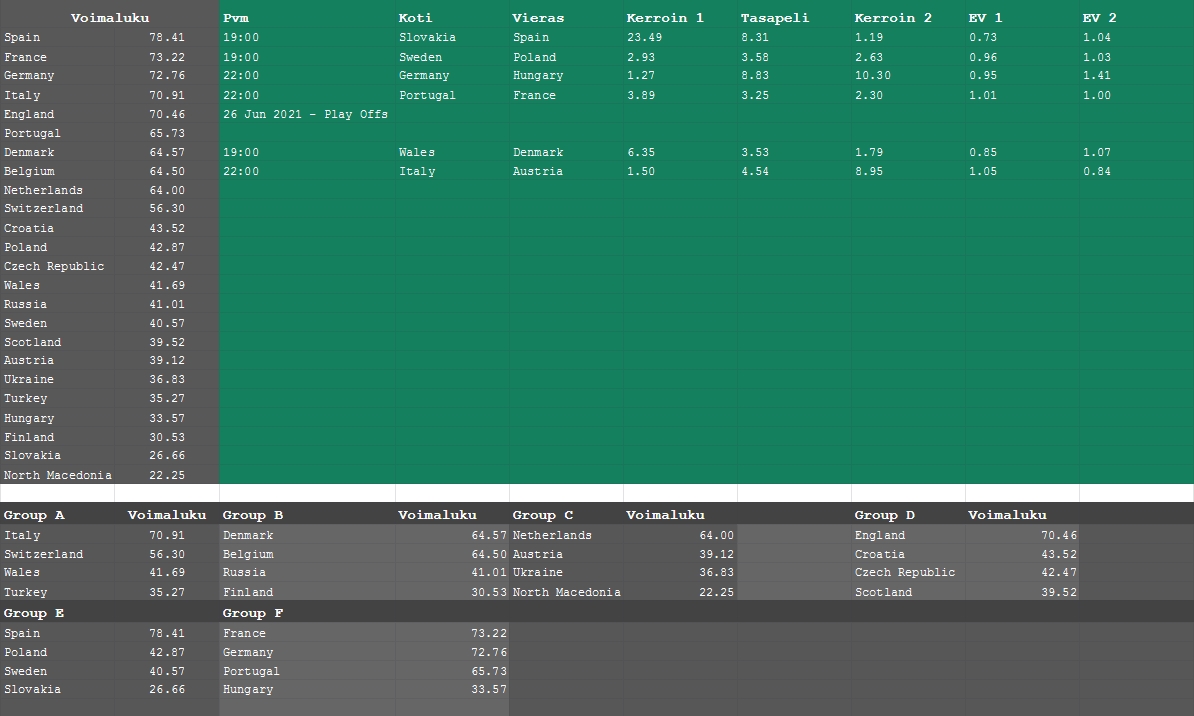 Tässäpä voimaluvuista lasketut kerroinrajat voittajavetoihin. Laskin ns. Impact valuen ja lukujen mukaan voittaja löytyy ryhmästä Espanja, Saksa, Englanti, Italia, Ranska, Belgia. Ylikertoimet: Espanja 10.00, Saksa 10.00, Italia 9.07, Tanska 29.00.