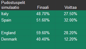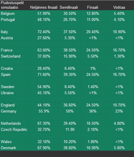 Pudotuspelien simulaatiot tehty. Simuloin jokaisen pudotuspelivaiheen 10000 kertaa. Impact valuen kolme parasta Saksa 2.59, Ranska 2.04, Espanja 2.02 ja merkittävät luvut myös Italialla 1.43 ja Englannilla 1.42. Nämä maat voittivat simuloidun turnauksen 7700 kertaa 10000:sta