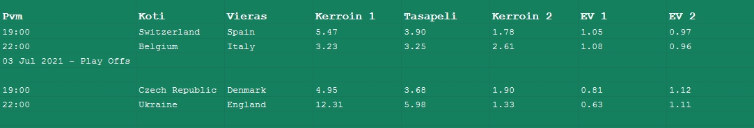 23.06.2021 18:50 <vippivippi> Minun listalla Belgia 8-12 ja Tanska 10-14 (ennen tätä turnausta)