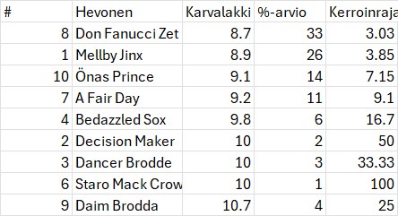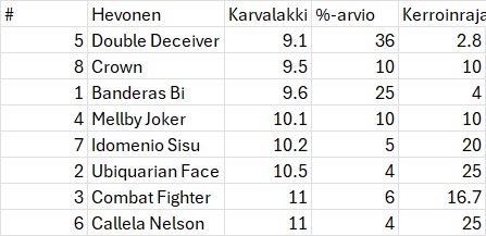 Karvalakkien perusteella Double Deceiverin pitäisi olla selvä suosikki ja sitä se peleissä onkin. Hevosesta jäi kuitenkin Vermossa vähän epämääräinen kuva, koska Örjan ei saanut sitä omin voimin kääntymään kilpailusuuntaan ennen lähtöä. Nyt riski jäädä johtavan rinnalle ja hevosen valmentaja rattailla. Ehkä tuo nykyinen peliosuus n. 40% on lähellä oikeaa. Sanotaan 36% eli voittajaraja jossain 2,8x:n haminoilla. Yleisesti ottaen lähtö on group 1 – tason lähdöksi melko vaatimaton ja tuli annettua yllättäjillekin jonkinlaiset saumat.