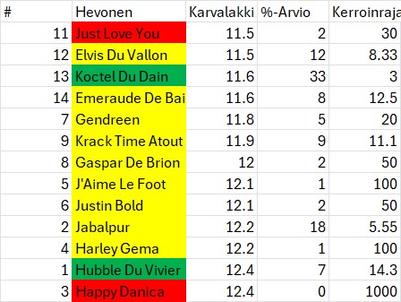 Hevoset värikoodattu (Vihreä paras, punainen huonoin) valmentajien odotusten mukaan esim. karvalakkiratingeissa ykkösenä oleva Just Love You juoksee tänään kengät jalassa ja pienin odotuksin. Valmentajan ennakkoon punaisella värillä merkityistä 213 hevosesta yksikään ei ole voittanut. Koctel Du Dain voisi olla selvempikin suosikki, mutta hevonen palaa pieneltä tauolta.