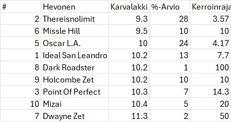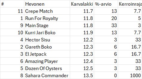 Lyhyet jälkipelit arvioista. Yhteensä viikonlopun vähintään 8% mahdollisuuksilla arvioiduista kerroinrajan ylittäneistä (voittajapeli) hevosista voitti 5 / 21 ja voittaneiden kerroinsumma oli 40.81 eli palautus% tasapanoksin n. 194%. Tyypillinen ylikerroin syntyi kun lähdössä oli ns. kuuma huuto useammalta maksulliselta vihjepalvelulta. Nuo huudot ylipelataan käytännössä aina ja siinäpä se syy miksi vihjepalvelut eivät pidä seurantaa. Toinen näkyvä syy kerroinvääristymille on klassinen ylireagointi. Esim. Pro maksoi 15.5x voittajassa lauantain avausmatkalla ja vain 7.7x sunnuntain maililla, vaikka oikeastaan mikään ei ollut muuttunut ennakkoasetelmissa.