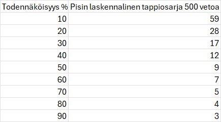 Laitetaan vielä pieni taulukko kuinka pitkiä tappiosarjoja voi kohdata eri todennäköisyyksillä osuvilla vedoilla/hevosilla esimerkiksi 500 vedon sarjassa.