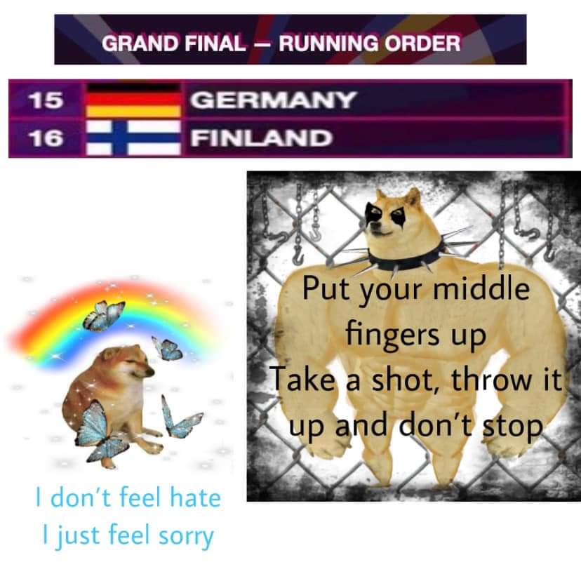 Sen verran kuraisaa paskaa on finaaliin menossa, että aika räväkkä ylikerroin. Hollanti on turvassa, Saksan meemipaska kerännee juuri ja juuri tarpeeksi teleä, Englanti ja Espanja voivat kyllä jäädä viimeiseksi. Sanoisin kuitenkin että Espanjalla on tarpeeksi hyvä show ja Embers on juuri ja juuri tarpeeksi hyvä biisi, että joku hajuton ja mauton Itävalta/Albania-tyylinen veisu tai ykkössemistä puskista jatkoon ponnistava Australia/Irlanti tms voi hyvin jäädä viimeiseksi. Vedonlyöntivihje: - Sijoittuu finaalin viimeiseksi - peliaika päättynyt