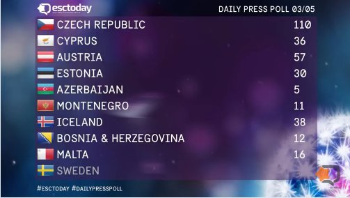 Myös Wiwiblogsilla Gabriela sai noin 25 % ja voitti selkeästi Maltan joka tuli toiseksi. Ja Wiwibloggsia lukee paljon Malta -ja Ira Losco faneja. Ehkä se Tshekki 100 kertoimella ei ollutkaan niin huono veto. Tuntuu, että ainakin kyllästyvät efektisirkuksiin, kun niitä tuntuu olevan puolet esityksistä. Itse en oikein usko tuohon, mutta ei esim. Venäjä tunnu enää niin hienolta kun monella muulla on kaikkea kikkakolmosta. Ei tule kontrastia. Sen vuoksi juuri esim. Ranska ja Ruotsi voivat olla vahvoilla. Ehkä. Täytyy pitää kirjaa pressi pollien korrelaatiosta semituloksiin ja kerroinmuutoksiin.
