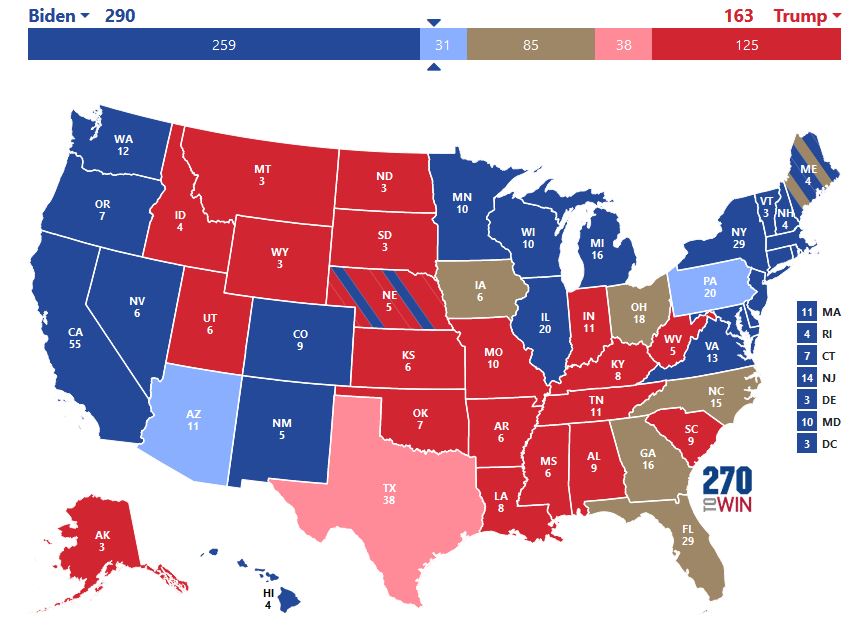 Tummansinisistä ja -punaisista olisin hyvin yllättynyt jos eivät näin pääty. Arizona vahvahko Biden, Nebraska 2D vahva Biden, Pennsylvania vahva Biden, Teksas vahvahko Trump. Florida, Georgia, NC, Ohio, Iowa ja ME2 pyöristetysti kolikonheittoja (Iowa vähän vähemmän, mutta sen nyt voi antaa vaikka suoraan Trumpille kun 6 valitsijamiestä joka tapauksessa vain tarjolla). Jos Pennsylvania edes pitää, niin ollaan jo maalissa. Jos Pennsylvania pettää, niin Arizonalla. Jos Arizona pettää, niin Pohjois-Carolinalla. Tai Floridalla. Jne. Näissä on sivumennen sanoen kivaa se, että on niin monta tapaa voittaa jotka eivät korreloi toistensa kanssa ihan liikaa. Myönnän, etten ole mitenkään täydellisesti kartalla eri osavaltioiden ihmisten sielunmaisemasta ja demografioista ylipäätään, mutta perstuntumalta huonomminkin voisi olla pullat uunissa kun on voittoon niin monta osavaltiota, jotka eivät keskenään ihan naapureita ole. Löytyy varmasti yhtäläisyyksiä vaikka Floridan ja Pennsylvanian tai Arizonan ja P-Carolinan välillä, mutta riittävästi myös eroavaisuuksia että mikä tahansa näistä voi realistisesti kammeta tiukassa kisassa Bidenin voittoon. (Georgian en usko melkein koskaan tulevan ellei Florida/Arizonakin ole sitten jo tullut, eli siihen en hirveästi toivoa laita)