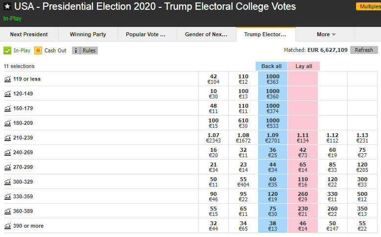 Tällä hetkellä Betfairilta saa n. 40 kertoimen siitä, että Trump saa lopulta valitsijamiehiä 390 tai enemmän sekä n. 35:n kerrointa siitä, että Trumpin saama osuus äänistä on 61% prosenttia tai enemmän. Kai näidenkin toteutuminen on lähes varmaa sitten, kun oikeus toteaa todeksi nämä salaliitot, joissa kommunistit Hugo Chávezin johdolla ovat totaalisesti väärentäneet vaalit.