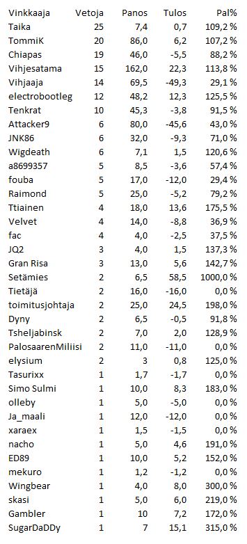 Vihjeet yhteensä: panokset 4.50, palautukset 1.50, tulos -3.00 yksikköä.