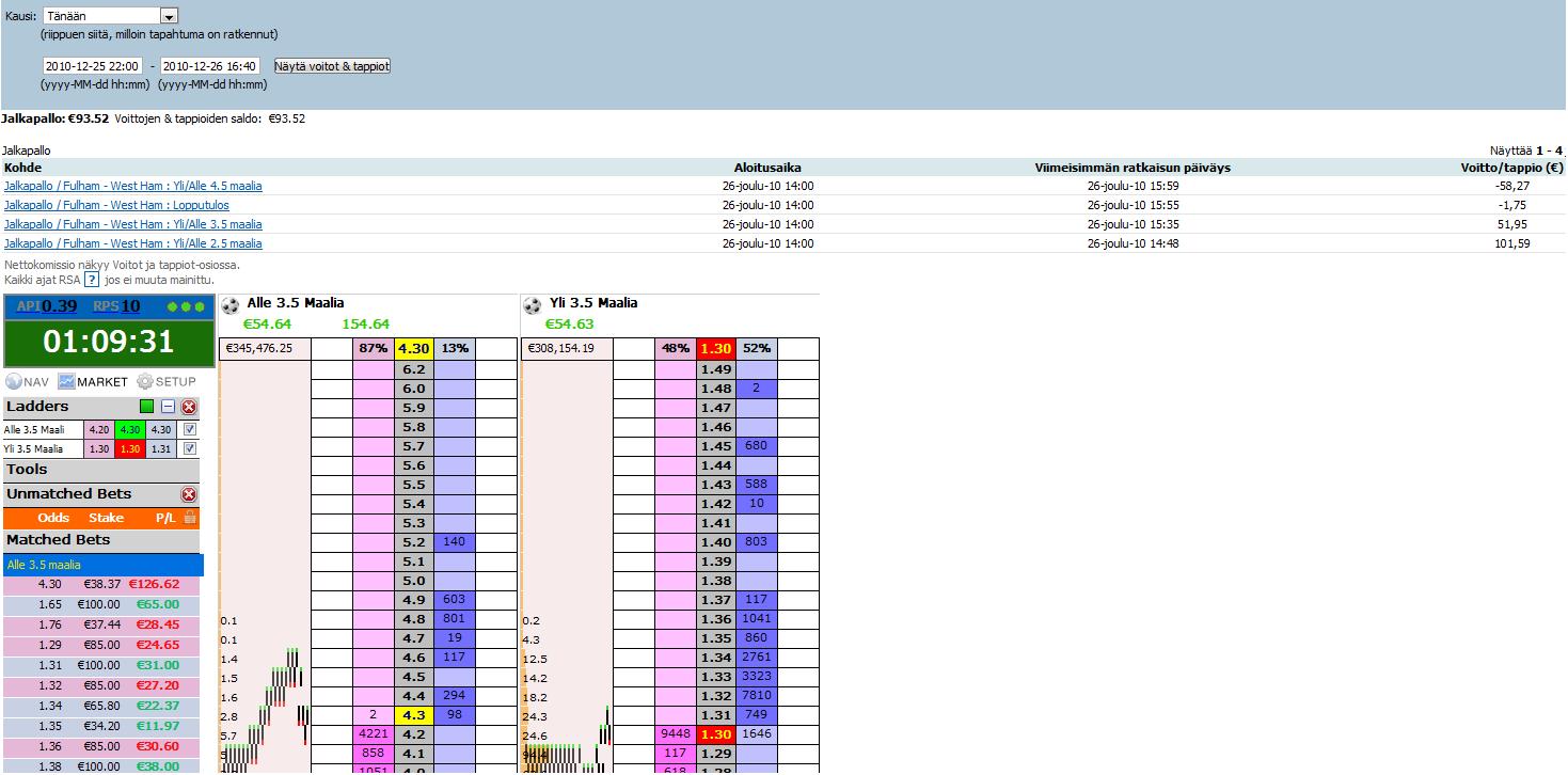 Tossa ottelussa pelasin neljää eri pelimuotoa, kahdesta voittoa ja kahdesta tappiota. Vaihdan totals-vedoissa aina isompaan rajaan pelit kun maaleja paukkuu lisää. Vedot on keskimäärin 5-100 euron panoksia, joskus lähtee jokunen isompi jos tosi selvä ero omissa rajoissa ja Betfairin kertoimissa. Nyt tuloksena +93€.