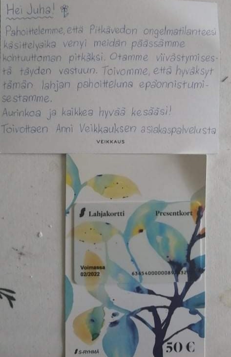 Taidan lähteä heti nuopparille kertomaan, että kannattaa etsiä hajasijoitettu pelikone ja pistää viikkorahat siihen. Saakohan tuolla lahjakortilla arpoja? Jos en saa niin aina voin monen muun tapaan ostaa lähdevettä ja laittaa panttirahat iloisesti soiviin ja vilkkuviin masiinoihin.Oikein hyvää kesää kaikille muillekin Veikkauksen annista nauttiville asiakkaille. :flower: