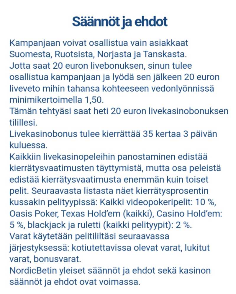 Tuli hyödynnettyä tuossa nordicbetin bonus missä kun lyö 20 euron livevedon niin saa 20 euron casinobonuksen eli 20 euroa pelirahaa. Tuli sitten ilmeisesti luettua hieman huolimattomasti tuon bonuksen ehdot. Bonus lunastettu ja pelailin jonkun aikaa star burstia ja sitten heitin veikkausvedot sisään niin tuli huomautus, että ei ole varaa pelitillä tarpeeksi vaikka saldoa oli vielä reilusti. Luin sitten tarkemmin nuo bonuksen ehdot ja huomasin, että pelatessa casinon pelejä ensin kulutetaan kotiutettavissa olevat varat ja sitten vasta muut. :twisted: